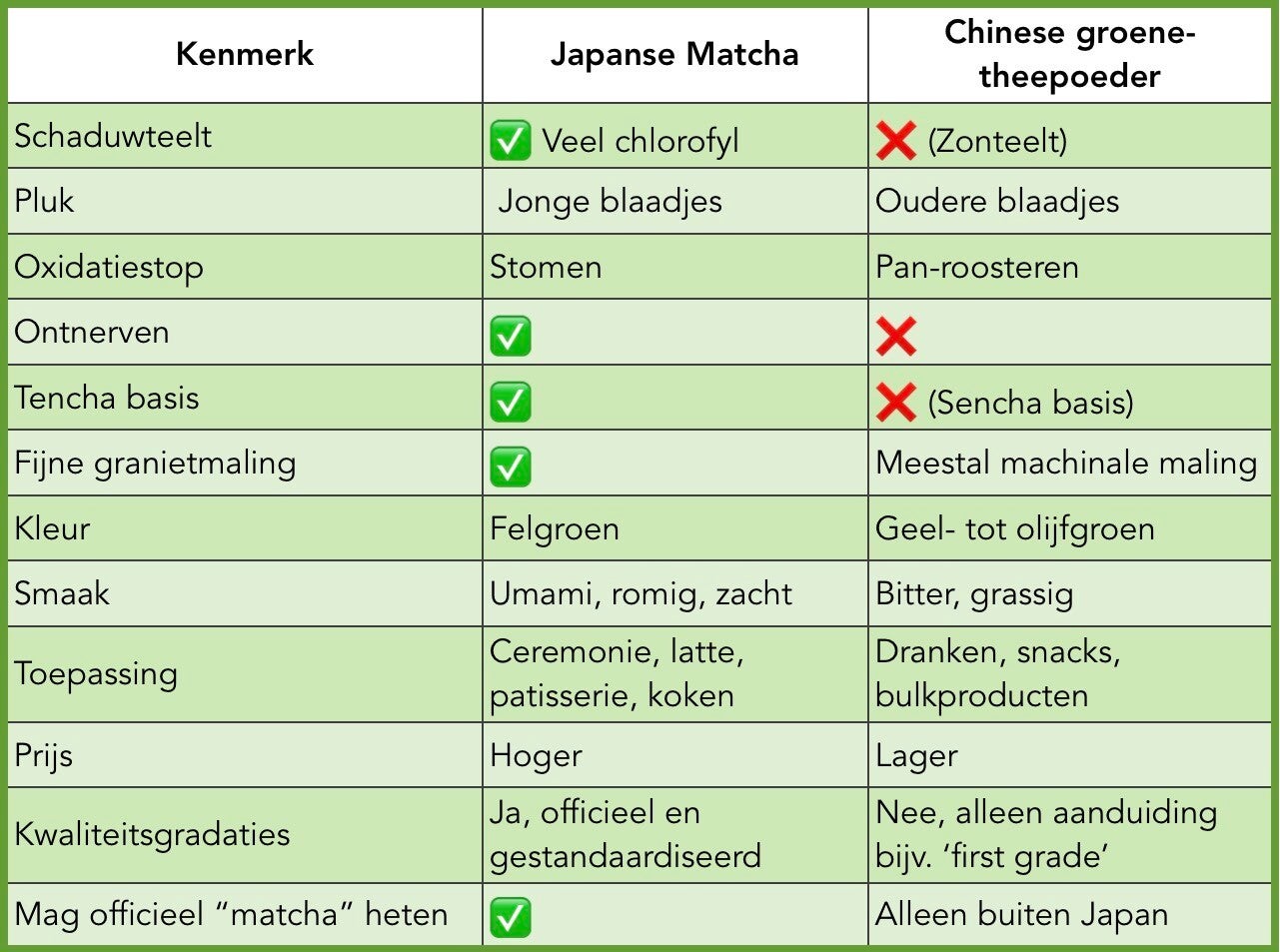 Een opvallend verschil wordt al zichtbaar bij openmaken van beide verpakkingen: de kleur! Hoe groener, hoe rijker aan L-theanine en hoe zachter van smaak. Maar zoals hierboven al beschreven zijn er veel verschillen niet zichtbaar. Daarom hieronder een overzichtje van alle verschillen tussen JAPANSE matcha en CHINESE `matcha’.